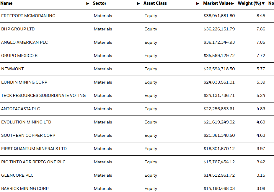 iShares Copper and Metals Mining ETF (NASDAQ: ICOP) provides diversified exposure to major global miners. Large Western producers such as Freeport and Newmont make up a significant share of its holdings.
