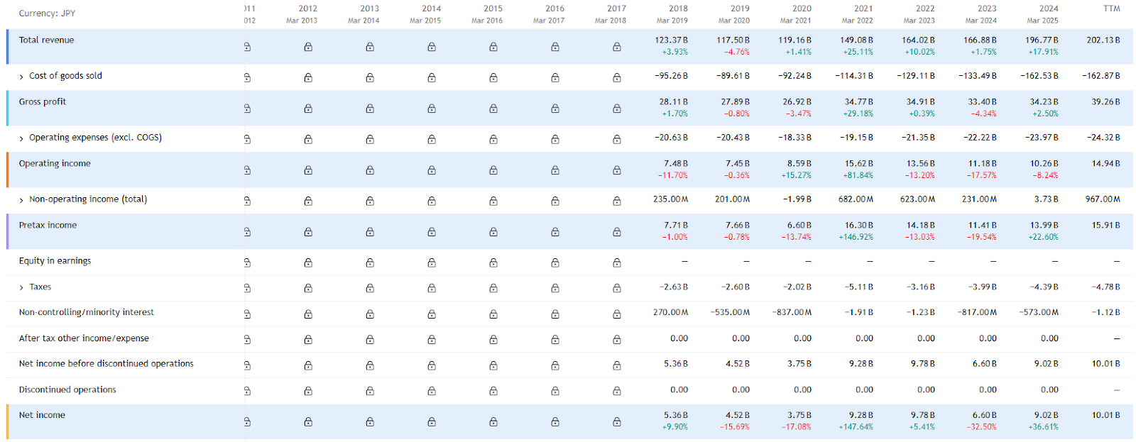 Dividend Yield: 1.37% (44.8 JPY per share annually; payout ratio 40.97%)