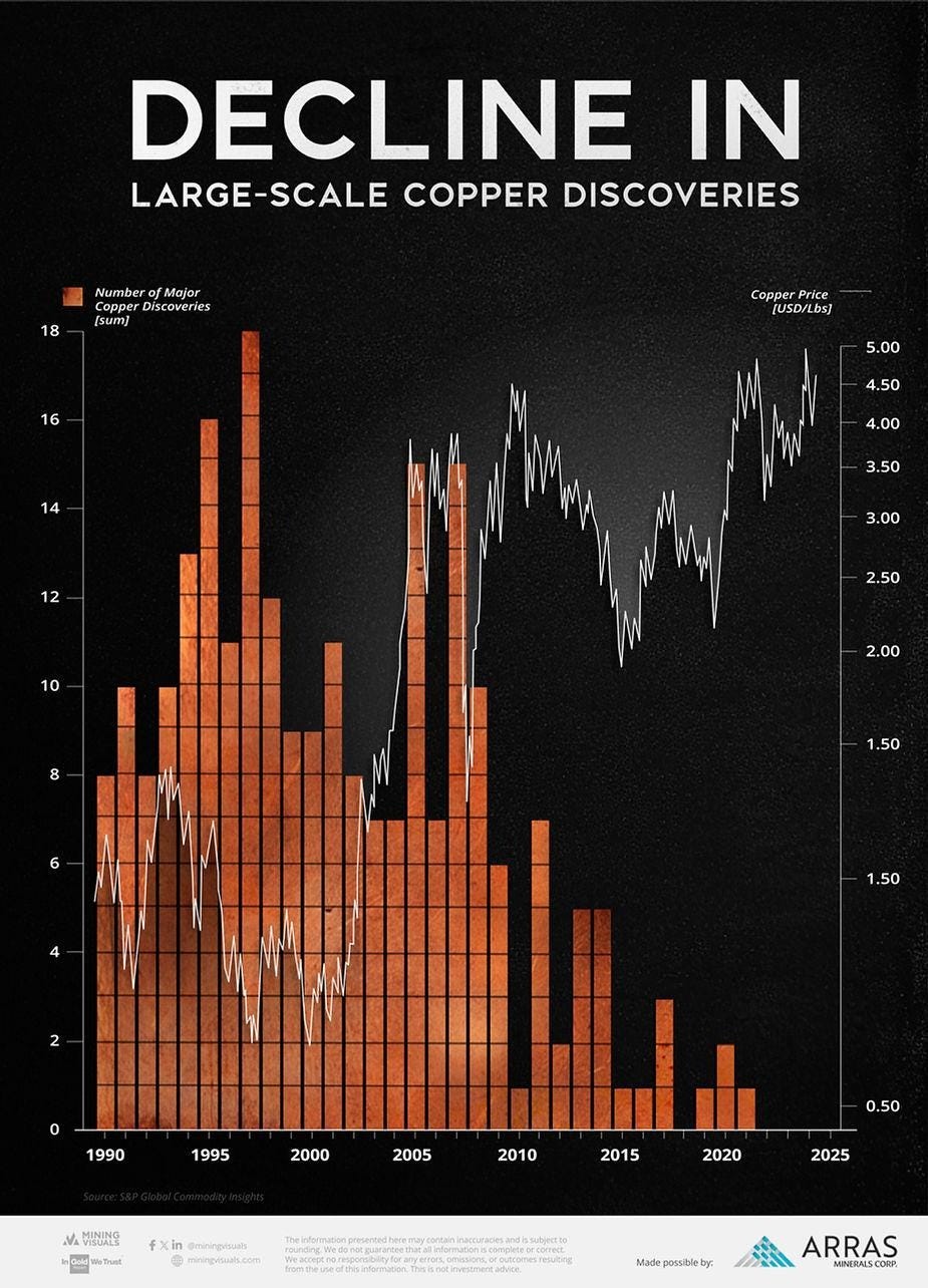 Start with supply. Major copper discoveries are becoming increasingly rare. Copper has always been considered “abundant,” but economically viable, high-grade deposits are harder to find than many assume. The pipeline of new, large-scale discoveries has thinned meaningfully over the past decade. When new supply struggles to keep up, the long-term risk tilts toward shortages — and markets tend to price that in early.