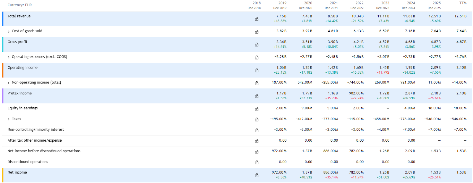 Universal Music is profitable: in 2025, its gross margin was 38.92%, operating margin 16.78%, and net margin 12.23%.