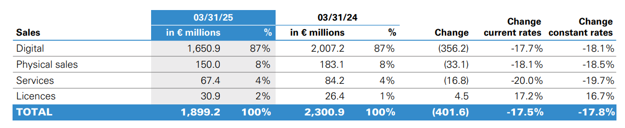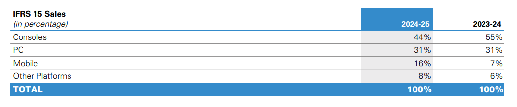 Most of Ubisoft’s sales are now generated online. Consoles account for the largest share at 44%, followed by a still-significant PC contribution of 31%.